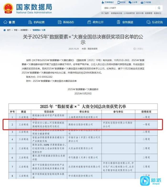 新派訊 日前,2025年“數據要素×”大賽全國總決賽圓滿落幕。濰柴《中國動力心臟——可信數據賦能高端制造全鏈協同與躍遷》項目,斬獲工業制造賽道一等獎,成為中國內燃機行業唯一獲此殊榮的企業,樹立了數據要素賦能生產制造的標桿,彰顯濰柴科技型公司“鏈主”實力。