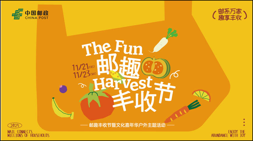“郵系萬家”彰顯了中國郵政深入基層、連接千家萬戶的服務(wù)根基;“趣享豐收”則代表了本次活動希望通過一系列趣味互動,讓市民共享郵政發(fā)展與地方農(nóng)業(yè)文化的豐碩成果。11月21日至23日,郵趣豐收節(jié)與你不見不散!